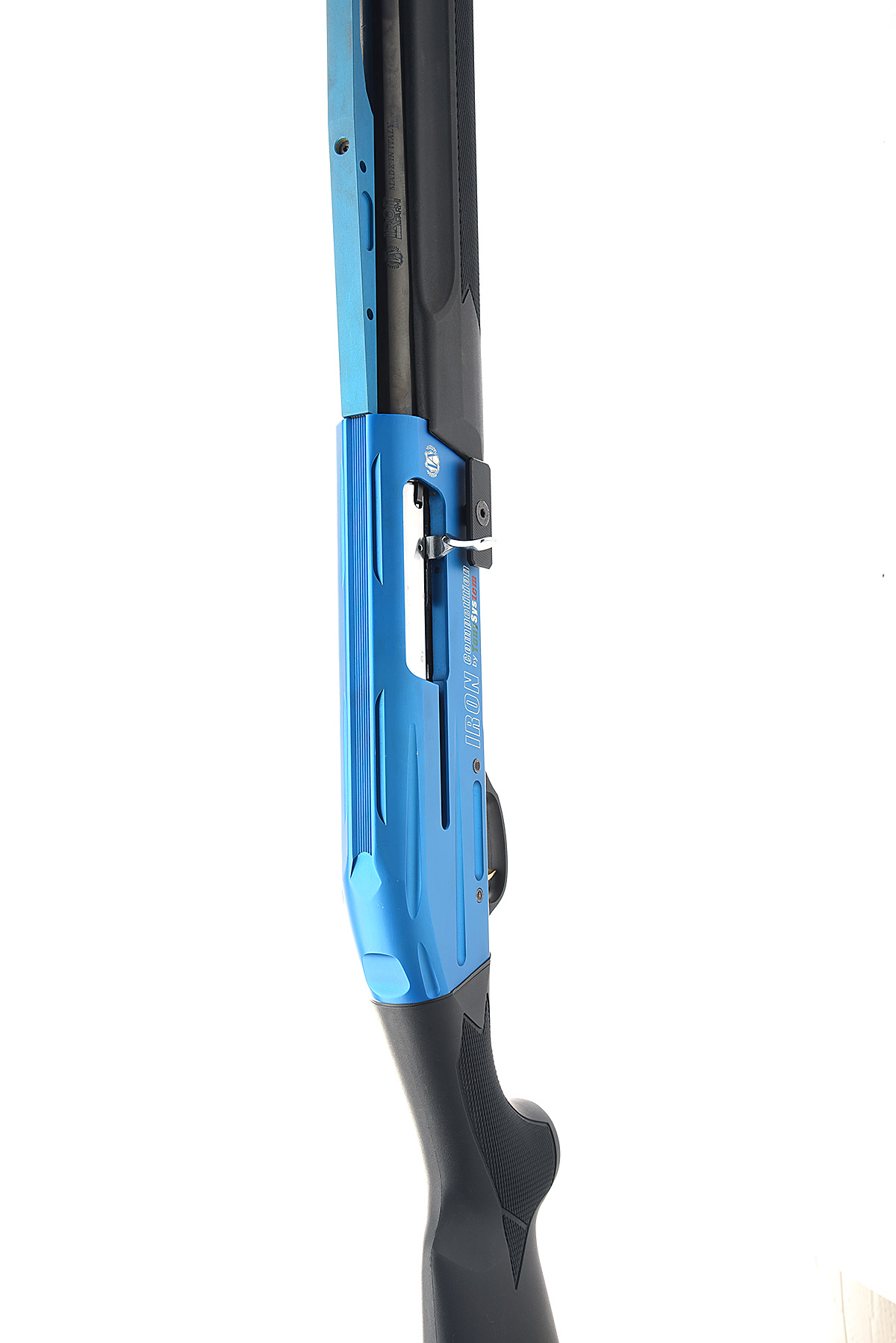 AN F.A.C. IRON ARMI 12-BORE (3IN.) 'COMPETITION BY TONY SYSTEM' SEMI-AUTO SHOTGUN, serial no. A00829, dated 2015, 26in. superior proofed nitro barrel with Toni system barrel bridge pointing system, milled receiver signed 'IRON COMPETITION BY TONY SYSTEM', enlarged cartridge insertion port, oversized bolt-release button, gold-washed trigger, manual push-button safety, 14 1/2in. polymer pistolgrip stock including ventilated rubber recoil pad, polymer fore-end, the whole in matt black and anodised blue finish, weight 7lb.