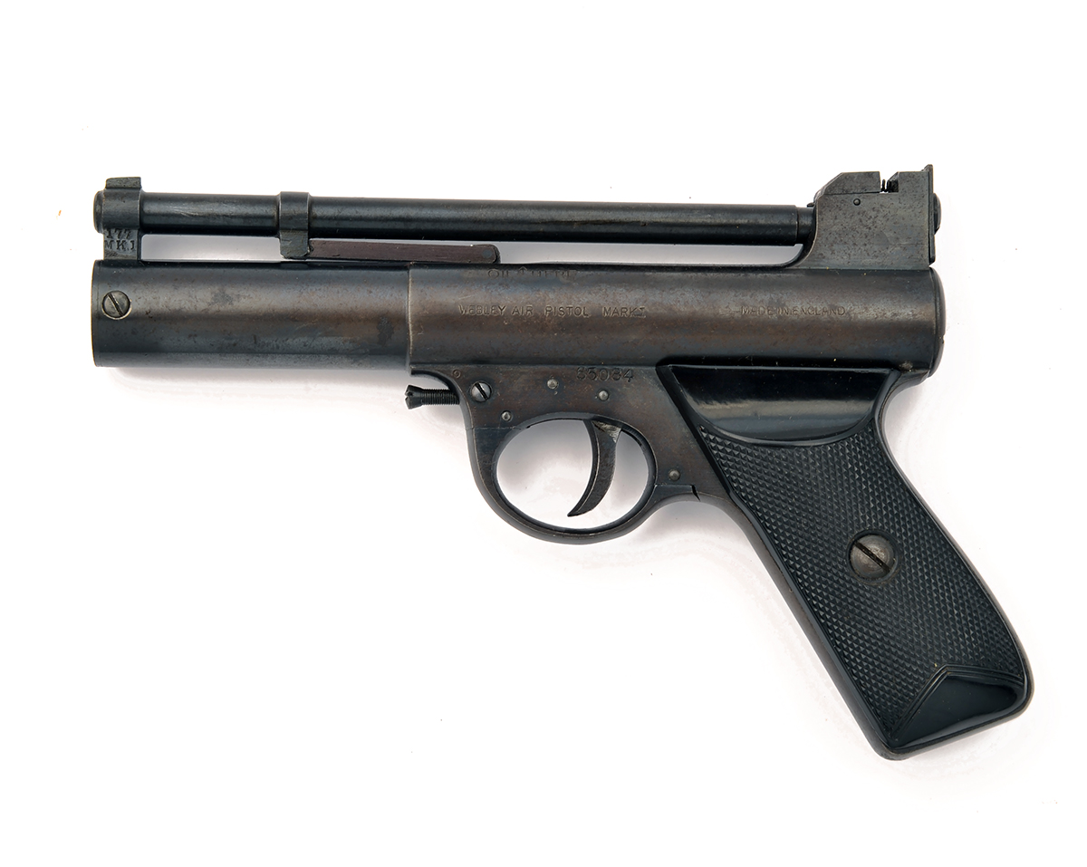 A .177 BARREL-COCKING AIR-PISTOL SIGNED WEBLEY & SCOTT, MODEL 'PRE-WAR MKI SLANT-GRIP', serial no. 65084, with 6 5/8in. barrel, stepped air-chamber and chequered bakelite grips, fair amount of finish remaining