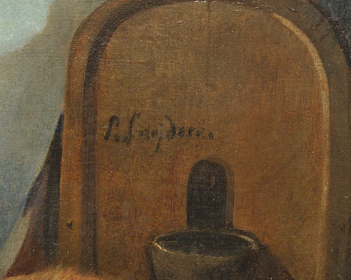 AN OIL ON CANVAS PAINTING OF 'GROUP OF DEAD GAME ON STONE SLAB', in the style of Frans Snyders, with a central depiction of a hare surrounded by various entomological and ornithological subjects, the background with a trap with a central signature of 'P. Snijderes' (indistinct), mounted in an ornate gilt frame measuring approx. 37 1/2in. x 32in., the lower edge with central plaque marked 'SNYDERS.', the rear of the frame with Art dealers label stating 'This picture has been cleaned, restored and revarnished by E. Stacy-Marks Ltd., Art Dealers, 120 - 122 Terminus Road, Eastbourne, Sussex', date: 21st October 1969, size: 30in. x 24in., title: 'Group of Dead Game on Stone Slab, Artist: F Snyders'