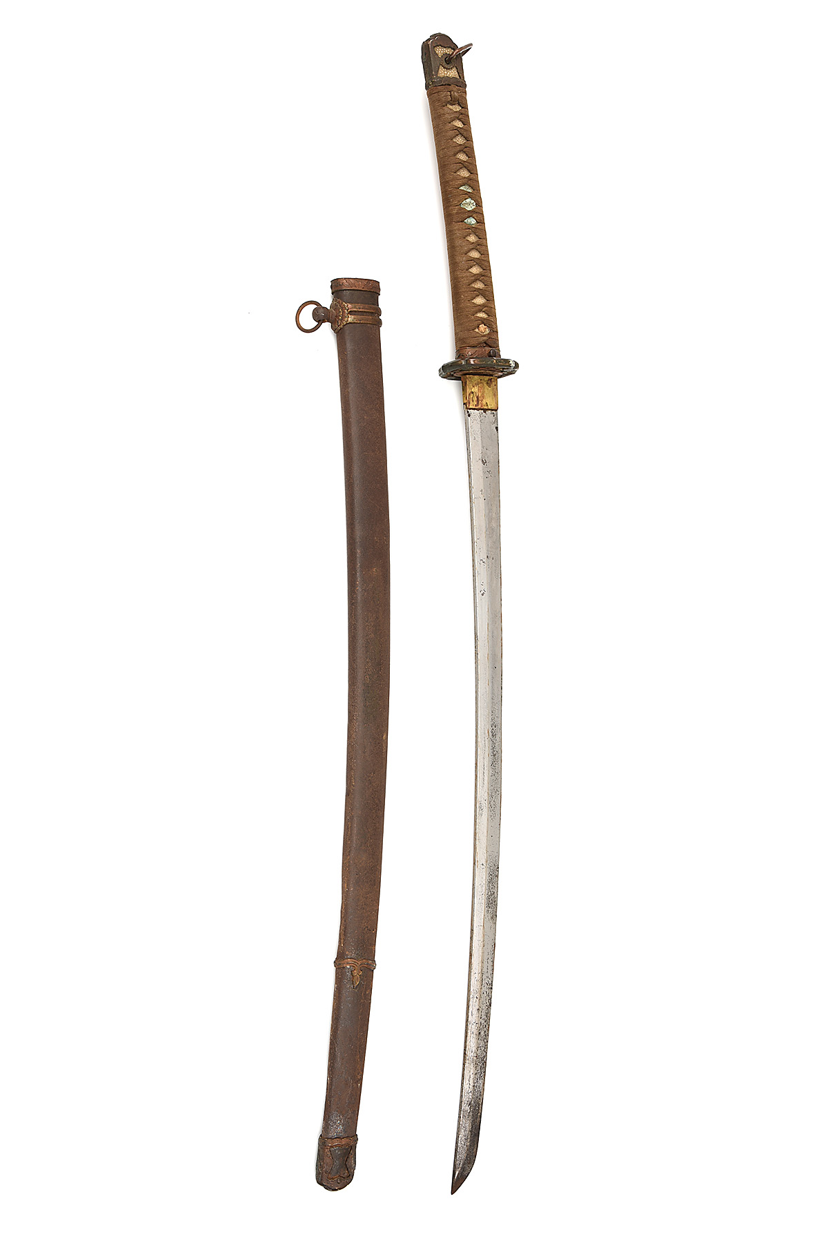 A JAPANESE WORLD WAR TWO OFFICER'S KATANA, in shin-gunto mounts, the 27in. blade cleaned and stained, locking catch broken, cotton bound hilt and iron scabbard (rusted)