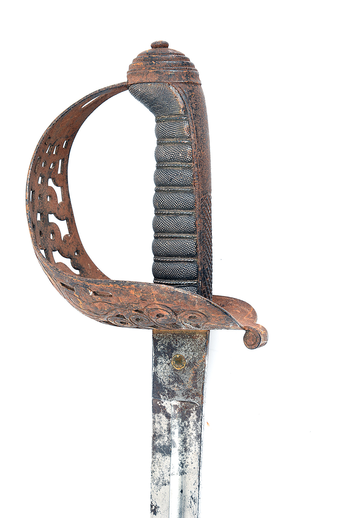 circa 1860s with 35 1/4in. double-fullered blade with engraved scrolling, 'V R' and crown with sun-burst above, ricasso marked 'Hamburger / Rogers & Co / King St / Covent Garden London', and inset Wilkinson proof-disc, shark-skin covered grip with white metal wire, 'honeysuckle' design pierced guard, blade stained with some pitting, hilt heavily rusted, no scabbard, 41 3/4in. overall