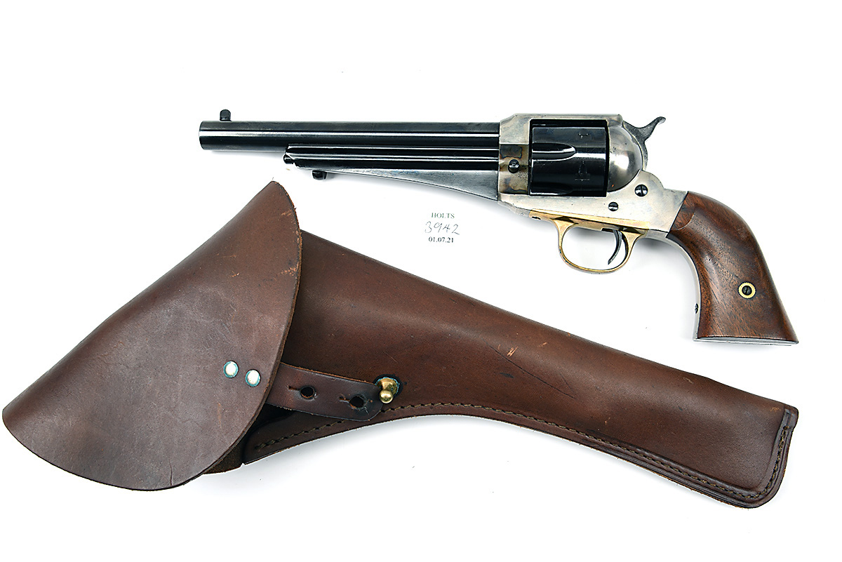 A .45 (LONG COLT) SIX-SHOT REVOLVER SIGNED UBERTI, MODEL 'REMINGTON 1875', serial no. 10377, with blued 7 1/2in. barrel, blued fluted cylinder, colour hardened frame and smooth walnut grips, overall length 13 3/4in., complete with a full-flap leather holster