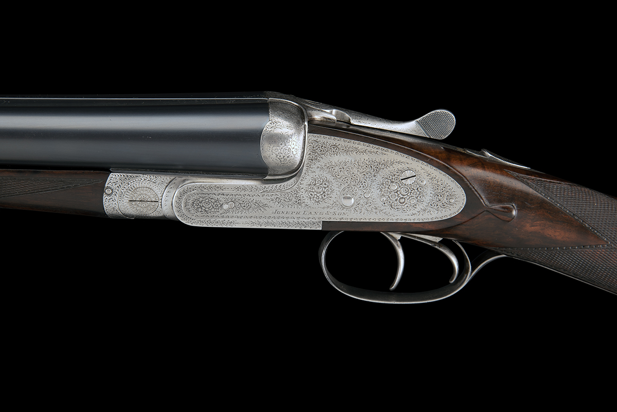 circa 1921, 30in. nitro barrels, rib re-engraved 'J LANG & SON Ld 102 NEW BOND STREET. LONDON.', 2 3/4in. chambers, bored approx. 1/4 and 1/2 choke, sideclipped treble-grip action with hidden third bite, automatic safety with gold-inlaid 'SAFE' detail, rolled-edge triggerguard, bouquet and scroll engraving, brushed bright finish, 15in. figured stock, weight 7lb. 6oz.
