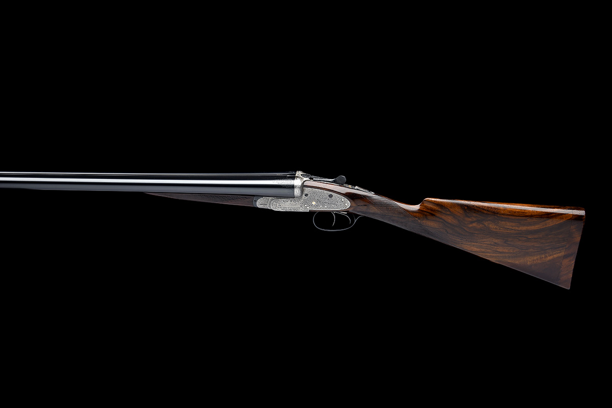 1940 - 1944, 25in. nitro chopperlump barrels, matt Churchill-rib gold-inlaid 'XXV' at the breech end, the tubes engraved 'E.J. CHURCHILL. (GUNMAKERS). LTD. ORANGE STREET GUNWORKS. LEICESTER SQUARE. LONDON.' and with a flash of scrollwork at the breech ends, 2 1/2in. chambers, bored approx. 1/4 choke in both, slender fences, automatic safety with gold-inlaid 'SAFE' detail, gold-inlaid cocking-indicators (right missing inlay), double rolled-edge triggerguard, border and profuse acanthus scroll engraving, bright finish, 14 1/4in. figured stock including 3/4in. wooden extension, weight 6lb. 2oz., in its makers tan leather 'V.C.' guncase