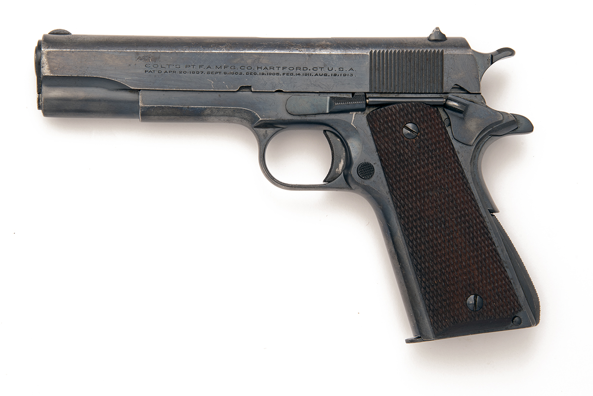 for first year of production,1929, with blued 5in. barrel, brushed bright chamber, blued slide signed by the maker and with patents to 1913, blued frame of 1911A1 type, chequered arched mainspring housing, grip-safe, spurred hammer and chequered walnut grips, complete with correct magazine, the whole in fine condition and apparently little used, overall length 9 3/4in.