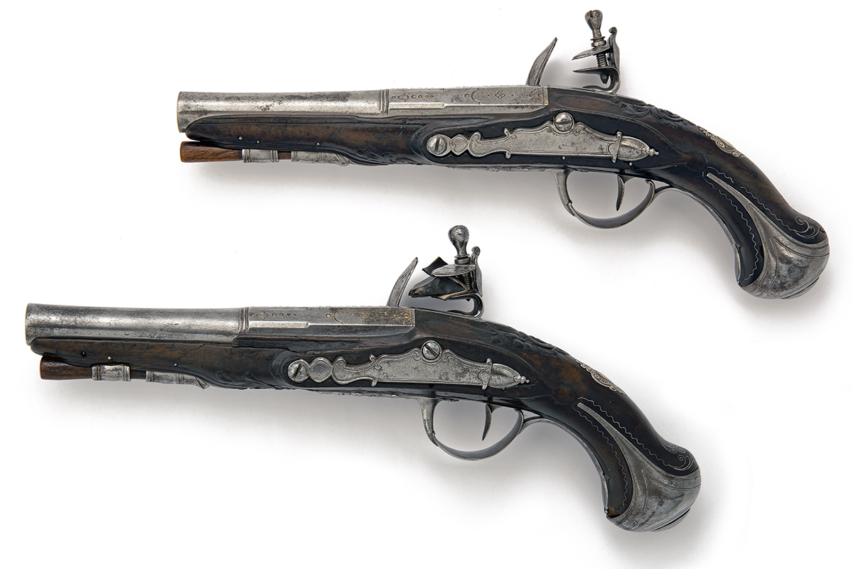 French, circa 1750, with swamped two-stage 6 1/4in. barrels of Spanish form, moulded band at the intersection, the breech flats decorated with punched engraving (traces of gilt infill), borderline engraved solid top-tangs, slightly curved strongly radiused brushed bright locks with moulded borders and signed below the pans 'BERTRAND RECOUDER A ORILIAC', bridle-less frizzens with broad springs, walnut full-stocks with carved borders around the furniture and relief-carved floral aprons, borderline engraved bulbous iron butt-caps with long side-spurs, further bordered by wire inlays, pillar fronted guards and probable original wood ramrods, each pistol 11 1/2in. overall