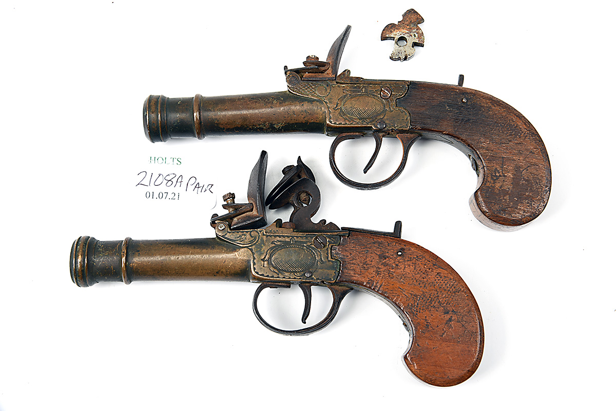 A PAIR OF 54-BORE FLINTLOCK BRASS-BARRELLED POCKET-PISTOLS FOR RENOVATION, UNSIGNED, no visible serial numbers, Continental circa 1800, probably Belgian, with 2 1/2in. cannon barrels, squared boxlock actions with central cocks (one broken off and missing, the other with broken jaw-screw), walnut slab-sided butts and guarded triggers, each 6 1/2in. overall, possible other faults