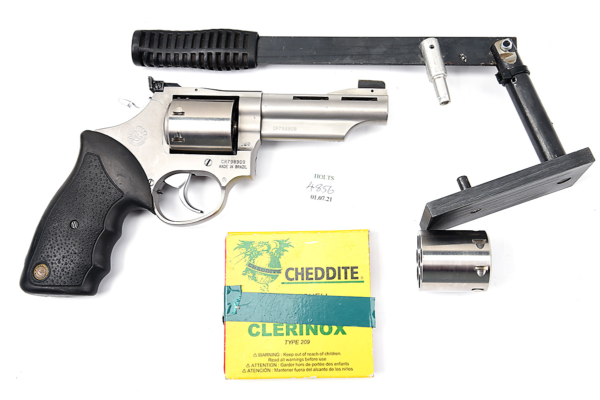 A BOXED MODERN .357 MUZZLE-LOADING REVOLVER SIGNED TAURUS, MODEL '669CF', serial no. CR798909, converted for the UK market to run on shotgun primers, with 4in. stainless barrel, vented rib, plain cylinder, solid frame and soft rubber grip, complete with a spare cylinder, bench loading tool, some primers and it's makers carton
