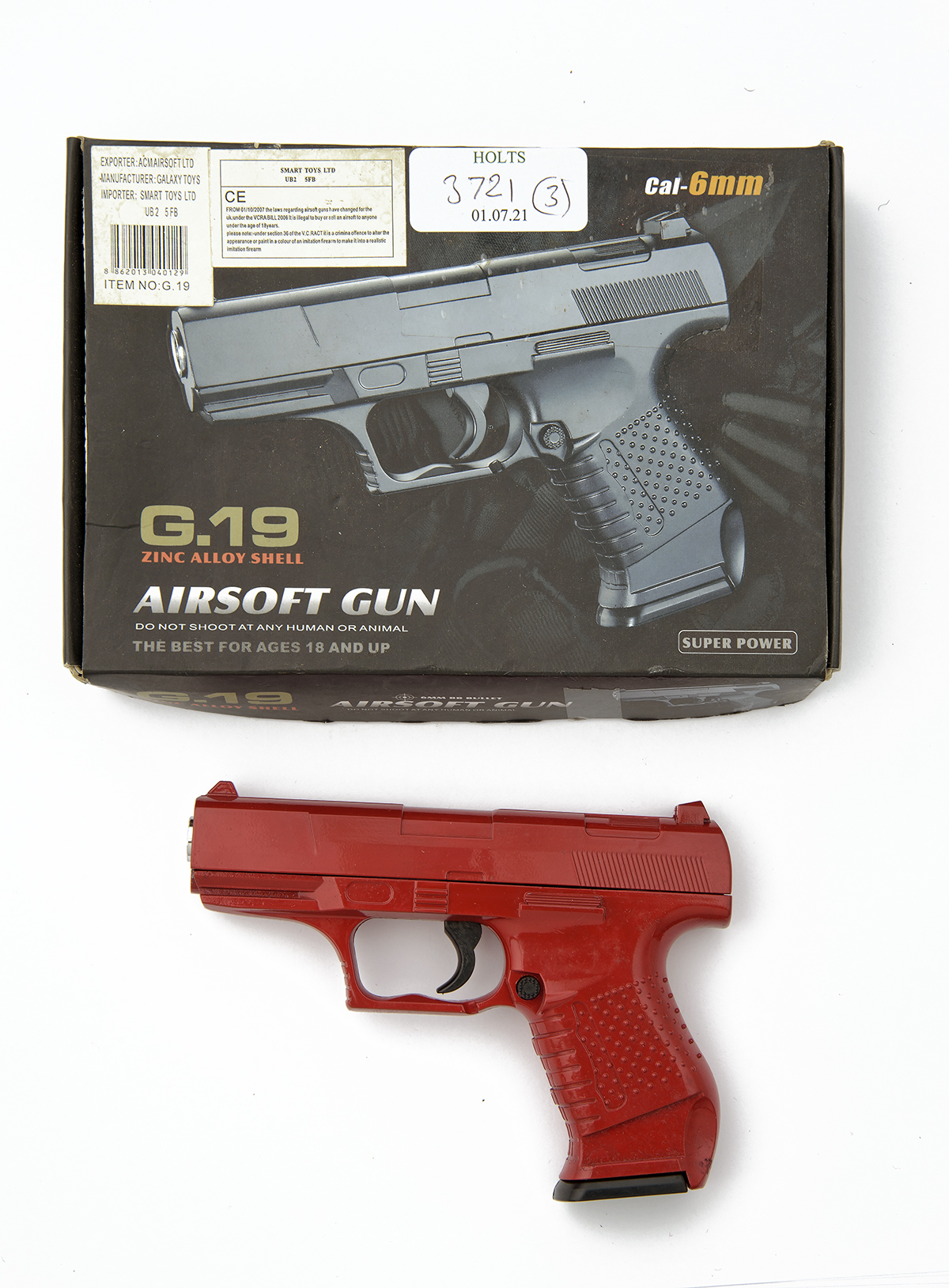 THREE BOXED 6mm (BB) AIR-SOFT AIR-PISTOLS, no visible serial numbers, all appearing little used and including a Model 'G21', a model 'G19' and a model ''G22', all in bright colours to comply with UK regulations