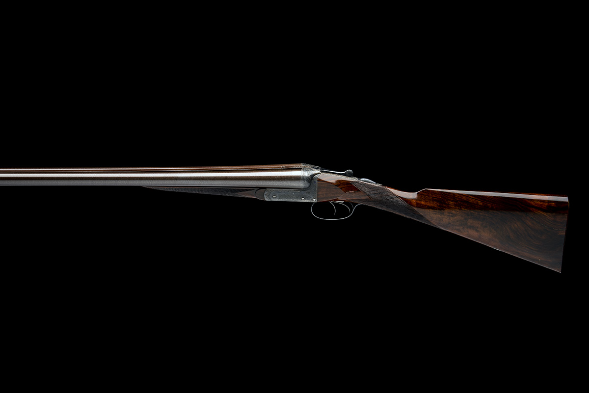 circa 1896, 30in. nitro reproved damascus barrels, rib engraved 'ARMY & NAVY C.S.L. LONDON.', 2 3/4in. chambers, bored approx. true cyl. and full choke, treble-grip action, removable striker discs, automatic safety with blue-enamelled 'SAFE' detail, intercepting sears, border and acanthus scroll engraving, retaining some colour-hardening and finish, 13 3/4in. figured stock (probable replacement, smooth unchequered butt, no buttplate), bolstered fore-end wood, weight 6lb. 3oz., in a leather case