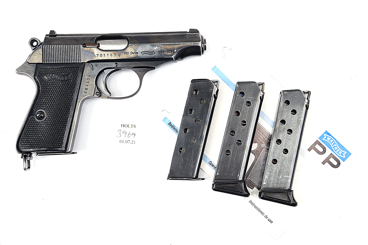 A BOXED 7.65mm (.32 ACP) PISTOL SIGNED WALTHER, MODEL 'PP', serial no. 701183, made in Walther's anniversary year of 1986, with 3 3/4in. barrel, blued slide and frame, chequered black plastic grip and complete with its makers plastic carton and four magazines, two restricted for UK law, overall length of pistol 7 1/2in.