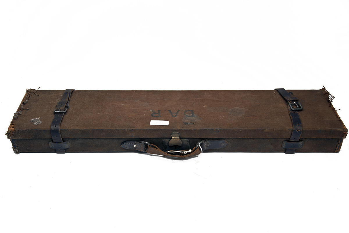 A CANVAS AND LEATHER SINGLE GUNCASE, fitted for 30in. barrels, the interior lined with green baize, brass lock (key missing)