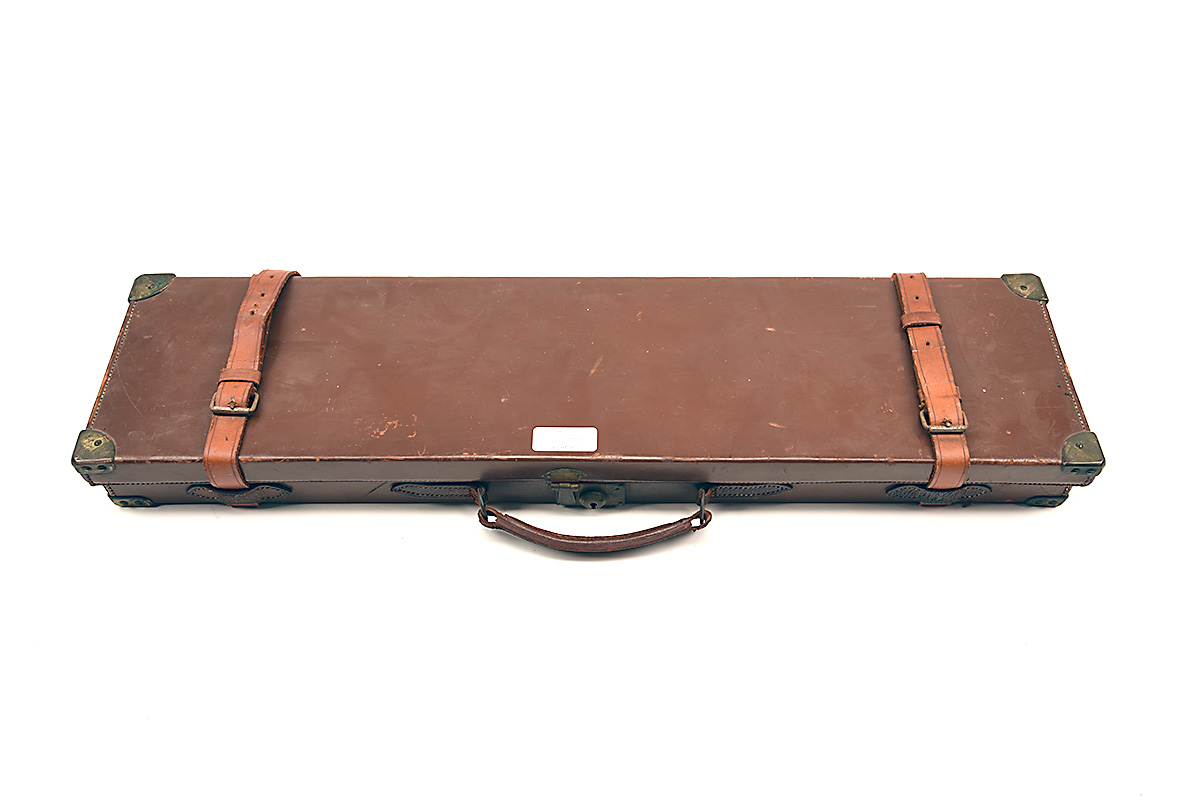 A WILLIAM P. JONES BRASS-CORNERED LIGHT-WEIGHT LEATHER GUNCASE, fitted for 26in. barrels, the interior lined with maroon baize, a William P. Jones trade lable, brass lock (key missing)