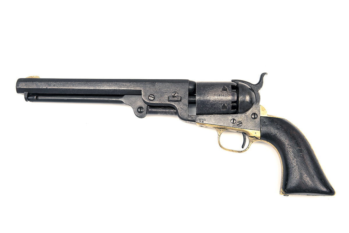 for 1857, with octagonal 7 1/2in. barrel signed on the top-flat 'ADDRESS SAML COLT NEW YORK CITY' (rubbed), matching number cylinder scrubbed of scene, open iron frame marked 'COLTS PATENT', brass grip-straps, smooth walnut grip (small losses at toe) small trigger-guard and articulated rammer, all matching numbers, overall length 13 3/4in., weight approximately 2 1/2lbs.