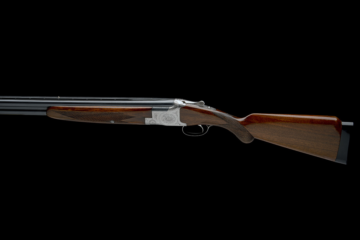dated 1954, 30in. nitro reproved barrels with 7mm ventilated matt rib, 2 3/4in. chambers, bored approx. 1/2 and full choke, hold-open toplever, manual safety with integral barrel-selector switch, floral and scroll engraving, bright finish, 14in. semi-pistolgrip stock including 7/8in. ebonite extension, weight 8lb.