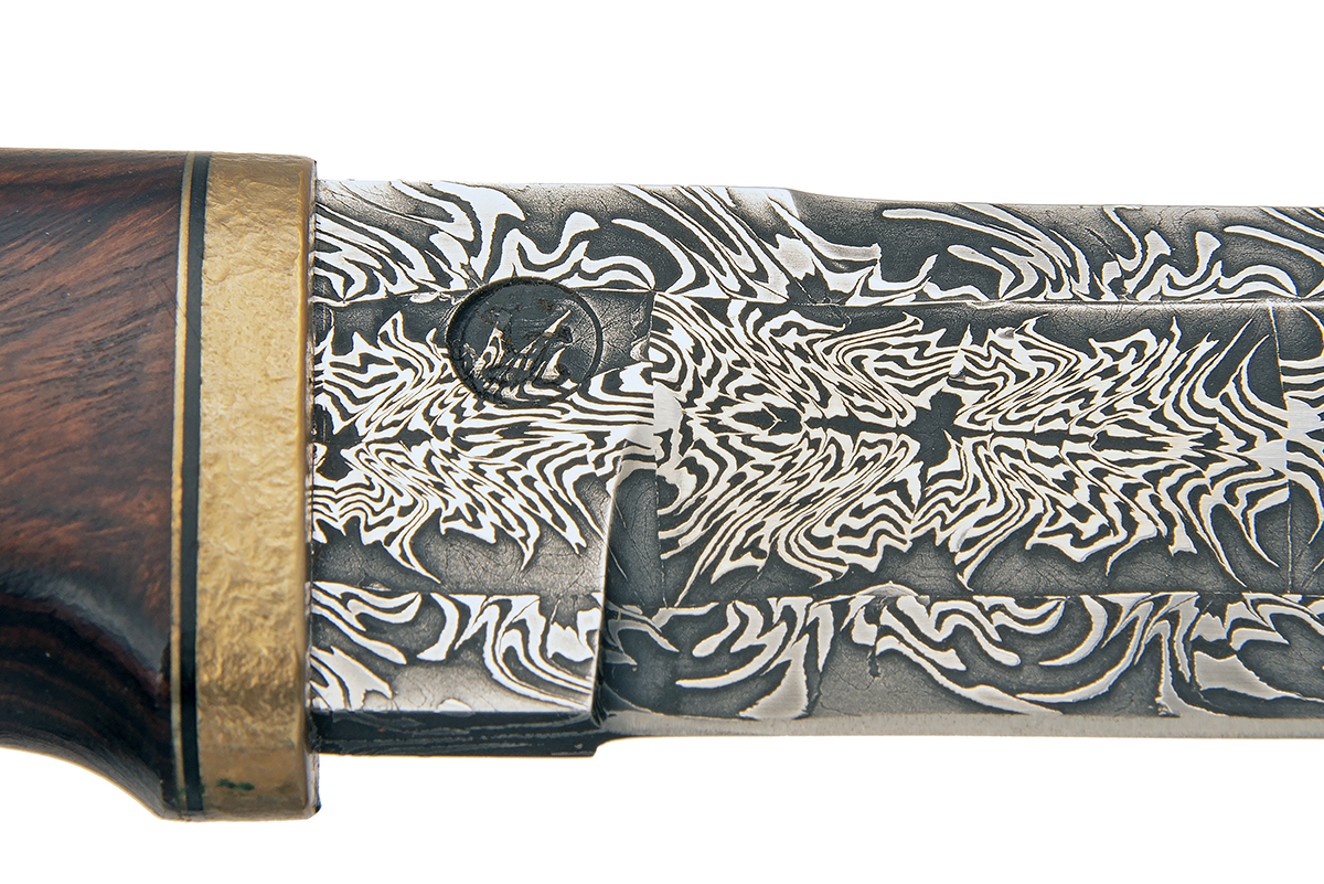 A FINE SPORTING KNIFE WITH MOSAIC DAMASCUS BLADE,