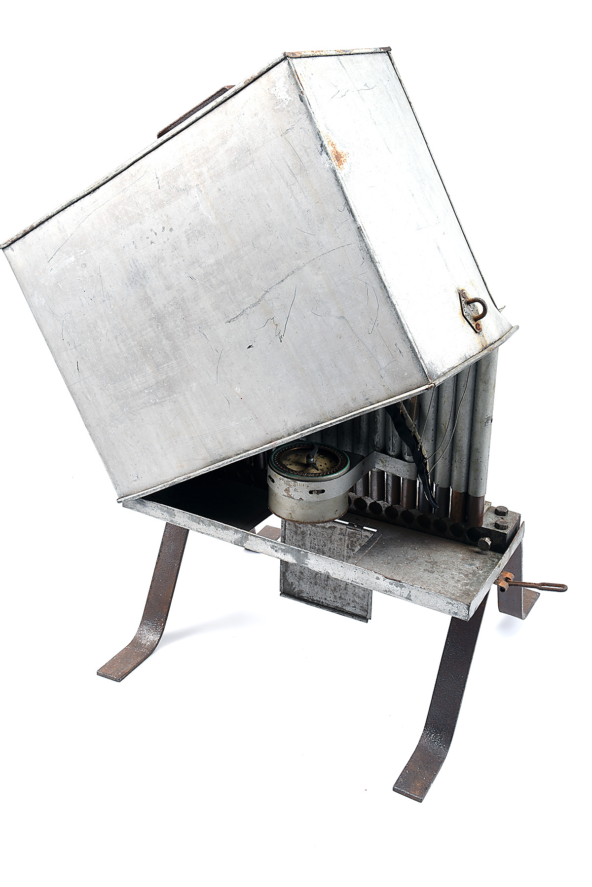 A SCARCE 16-BORE PINFIRE PATENT CLOCK BIRD-SCARING GUN, MODEL 'LIGHTWOOD'S PATENT', no visible serial number, circa 1900, with lift-off rectangular galvanised casing standing on iron bar feet, the mechanism comprised of 18 dropping weights held aloft in tubes by twine and in turn attached to a recumbent clockwork mechanism, the conventional hands replaced with a hooked hand releasing the twine at the pre-selected times allowing the weight to discharge one of 18 horizontally mounted pinfire blanks, clock apparently functioning.