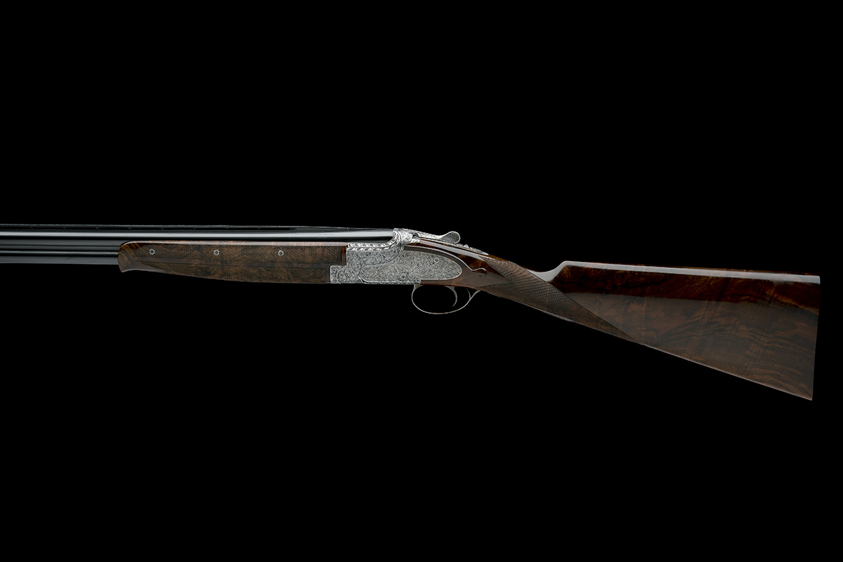 serial numbered to 1953, 26 1/2in. nitro barrels with 6mm ventilated matt top-rib, 2 3/4in. chambers, bored approx. 1/2 and imp. cyl. choke, one-piece fore-end effectively decorated to give the appearance of a three-piece, hold-open toplever, manual safety with gold-inlaid 'O', 'U', and 'S' details, the action, decorative sideplates and furniture finely engraved with bold acanthus motifs, the triggerplate signed 'P. JACOBY', bright finish overall, 15in. well-figured stock, weight 6lb. 11oz., in a Browning universal case