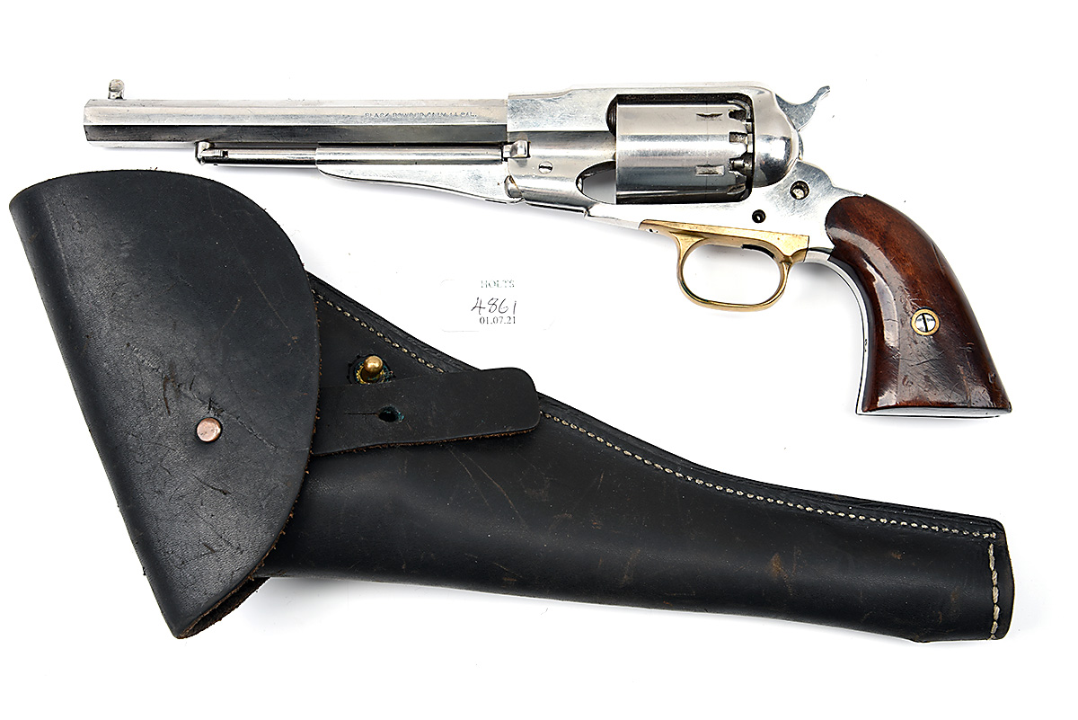 A REPRODUCTION .44 PERCUSSION REVOLVER FOR SPARES SIGNED PIETTA, MODEL 'REMINGTON ARMY', serial no. 243051, with stainless 8in. octagonal barrel, plain cylinder, solid frame, missing trigger and action screws, in a leather holster