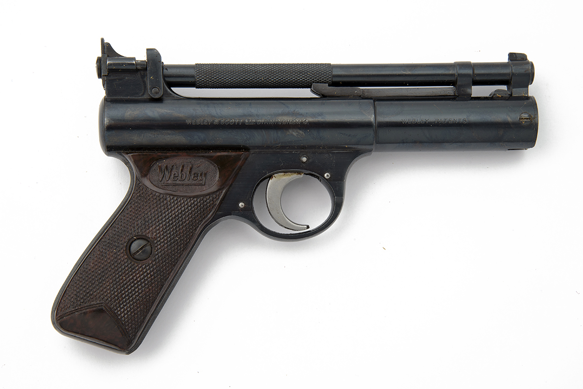 A BOXED .22 & .177 BARREL COCKING AIR-PISTOL SIGNED WEBLEY & SCOTT, MODEL 'SENIOR', batch no. 552, circa 1959, with blued 6 5/8in. barrel, blued stepped air-chamber. brown chequered bakelite grips, appearing little used complete with a spare barrel and original pellet sample envelope in its maker's green labelled carton (repaired)