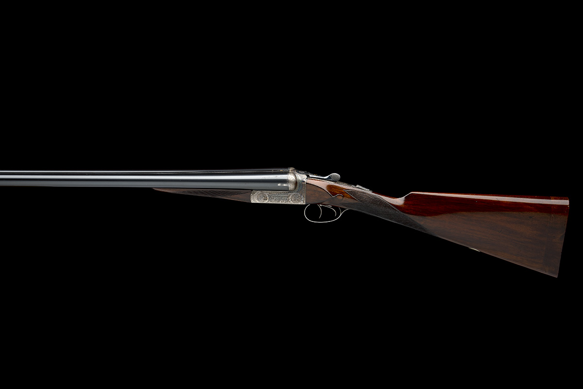 circa 1939, 26in. replacement nitro barrels (in 1972), the rib engraved 'CHARLES HELLIS & SONS LTD. 121 & 123 EDGEWARE ROAD. HYDE PARK. LONDON. W.', and inlaid 'FOR 2 INCH CASE ONLY' (worn) and gold-inlaid '1', 2in. chambers, bored approx. 1/2 choke both, toplever gold-inlaid '1', automatic safety, acanthus scroll engraving with floral bouquets, retaining some original colour-hardening and finish, 14 7/8in. stock including 1in. wooden extension, weight 5lb. 13oz., in a brass-cornered leather hammergun case with Charles Hellis 121-123 Edgeware Road address trade label