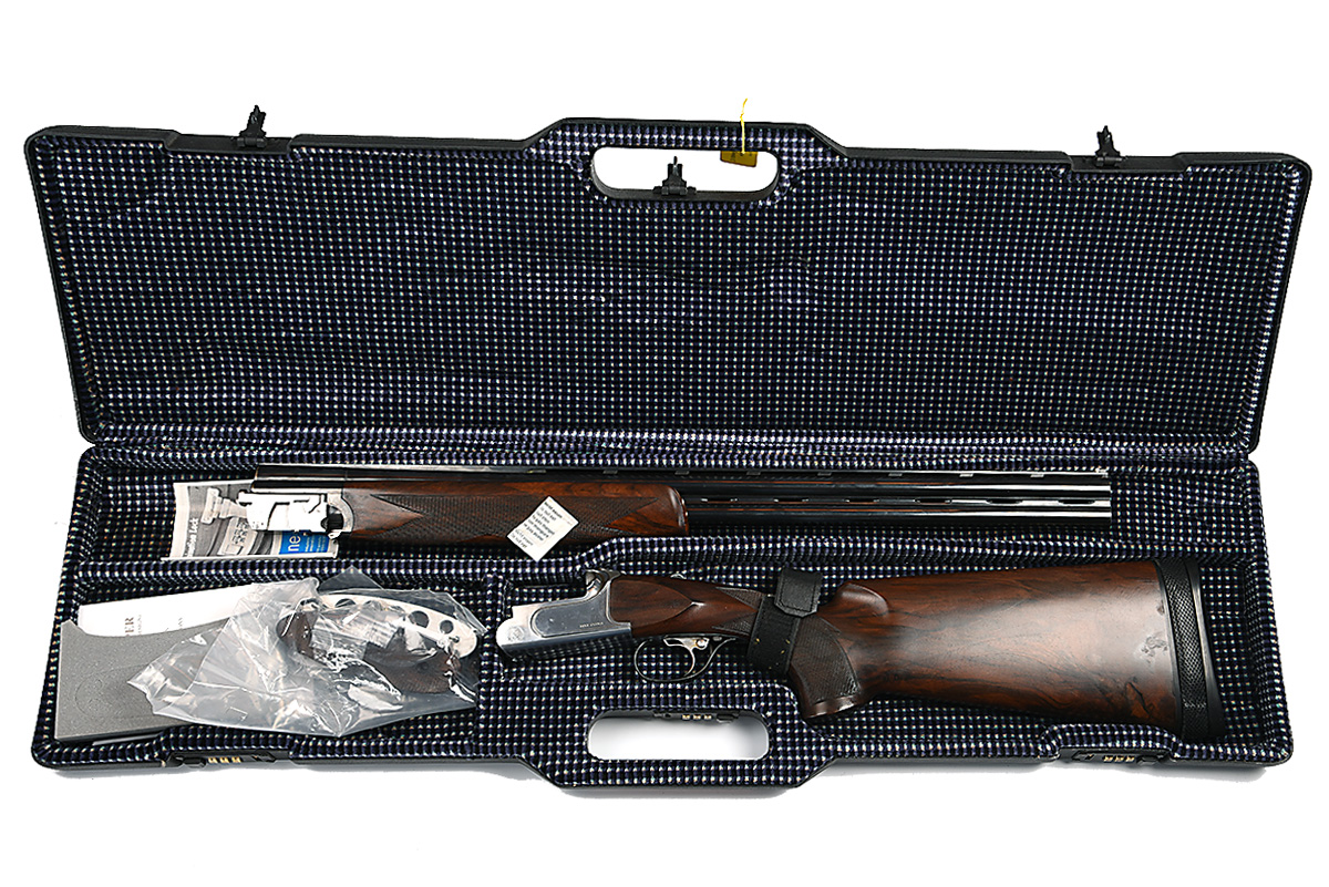 RENATO GAMBA 12-BORE 'DAYTONA' SINGLE-TRIGGER DETACHABLE TRIGGERPLATE-ACTION OVER AND UNDER EJECTOR, serial no. 25115, with extra barrels, no. 25530, for 1996, 25 1/2in. nitro barrels with 9mm ventilated matt top-rib, ventilated mid-rib, 2 3/4in. chambers, bored approx. true cyl. in both; additional 31in. nitro barrels, dated 1997, with 10mm ventilated matt rib, ventilated mid-rib, 2 3/4in. chambers, bored approx. 1/4 and 1/2 choke, hold-open toplever, manual safety, detachable triggerplate, border engraving, silver finish, 15 1/2in. figured pistolgrip stock including 1 1/2in. recoil pad, weight 8lb. 5oz. (25 1/2in. barrels) and 8lb. 14oz. (31in. barrels) in its universal case with original buttplate and provision for one set of barrels