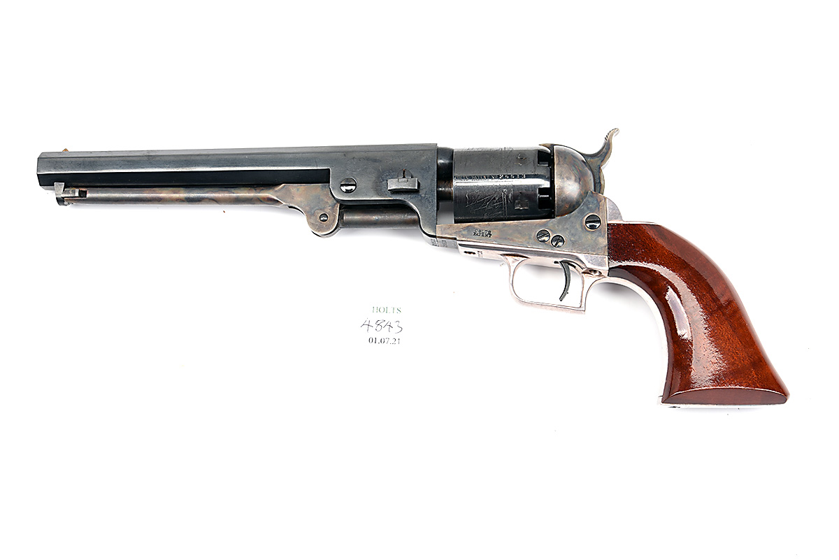 A BOXED REPRODUCTION .36 PERCUSSION REVOLVER SIGNED COLT, MODEL '1851 NAVY', serial no. 25513, part of the Authentic Blackpowder Series, with blued 7 1/2in. barrel, blued roll engraved cylinder, colour hardened open iron frame, silver plated grip-straps, square-backed guard and smooth walnut grips, appearing unused in its maker's card carton, pistol 13 3/4in. overall