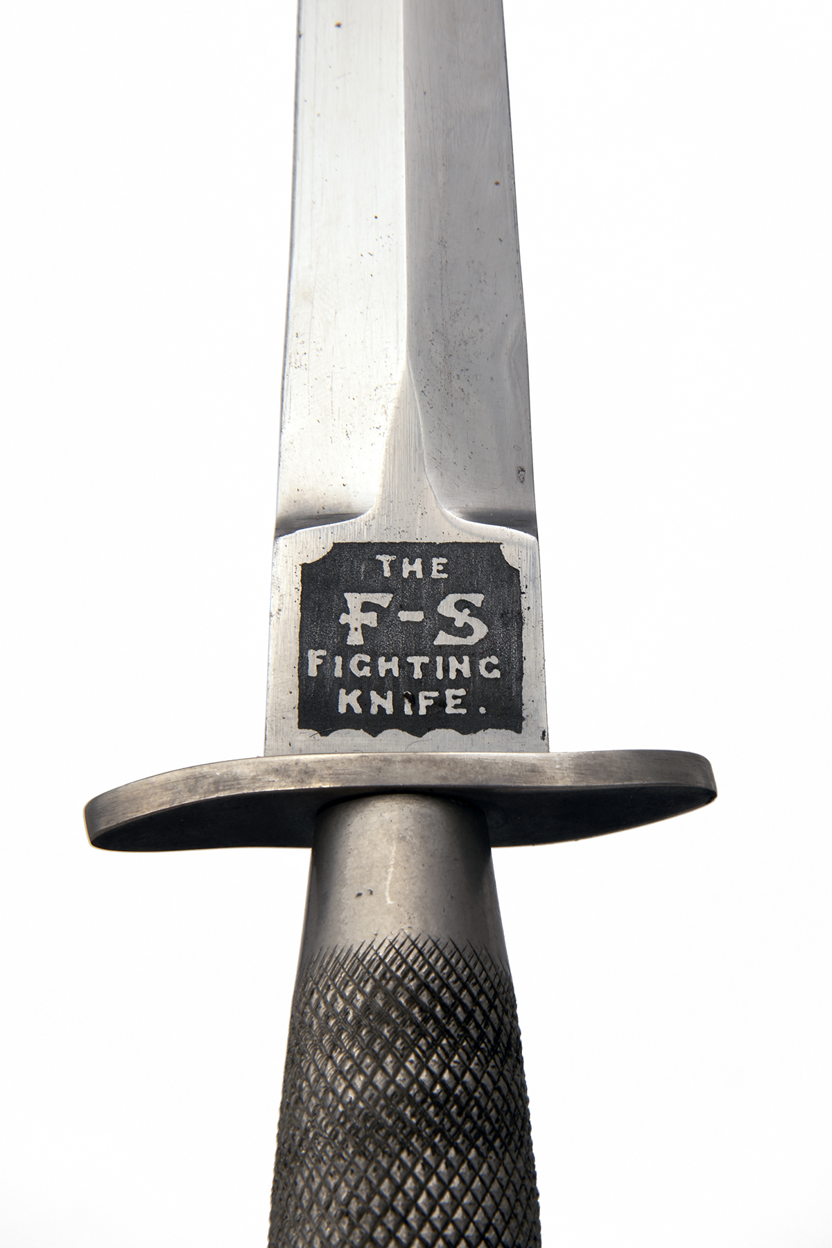 1941/42, with narrow-form straight double-edged 6 3/4in. polished needle-point blade, squared ricasso etched 'WILKINSON SWORD CO LTD. LONDON' below crossed swords and 'THE F-S FIGHTING KNIFE' on the reverse, nickel 'S' shaped cross-guard of 2in. length, chequered nickel hilt swelling at the centre and pommel and fixed with a bun nut, fine condition and complete with its period brown leather scabbard with nickel chape, press-stud securing strap and leather sleeve-tabs, also good condition