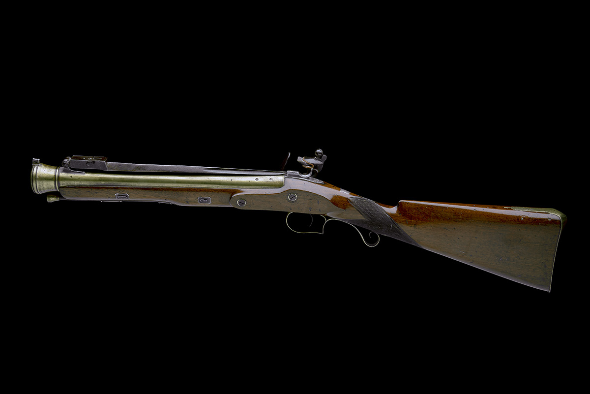 circa 1800, with round 14in. barrel, flaring muzzle with moulded bands and signed at the breech in script 'LONDON', triangular section bayonet with concave faces stored along the top of barrel and released via a catch on the tang, bevel-edged flat lock signed 'WESTWOOD' below the pan, engraved stepped tail, ring-necked cock with sliding safe behind, walnut full-stock chequered at the wrist, engraved brass furniture including square-backed guard with raised scrolled tang and replacement brass-tipped ramrod, 30 1/2in. overall, weight approximately 7lbs.