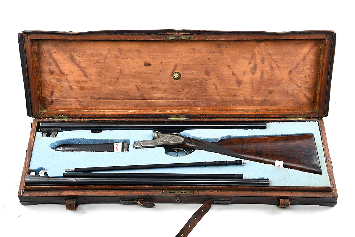 removable striker discs, automatic safety, bouquet and scroll engraving, 15in. replacement stock, weight 6lb. 11oz. (original) 6lb. 13oz. (extra), in a brass-cornered oak and leather case with provision for both sets of barrels