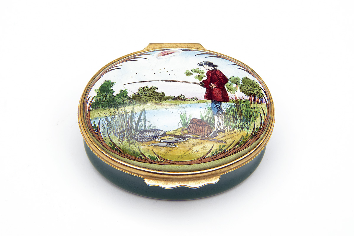 TWO HALCYON DAYS ENAMEL GAME SCENE PILL BOXES