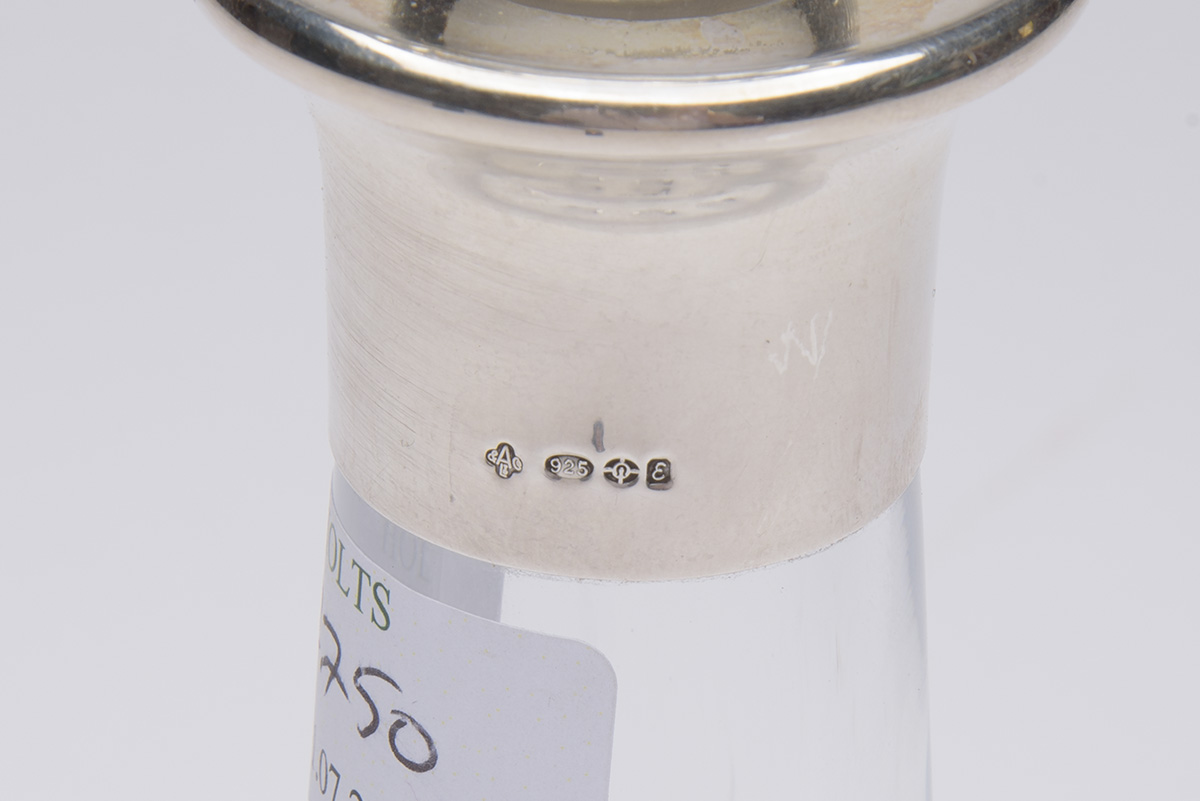 AN ASPREY SILVER AND CRYSTAL GLASS DECANTER, with A&Co. Ltd 925 silver hall marks dated 1964-1967,