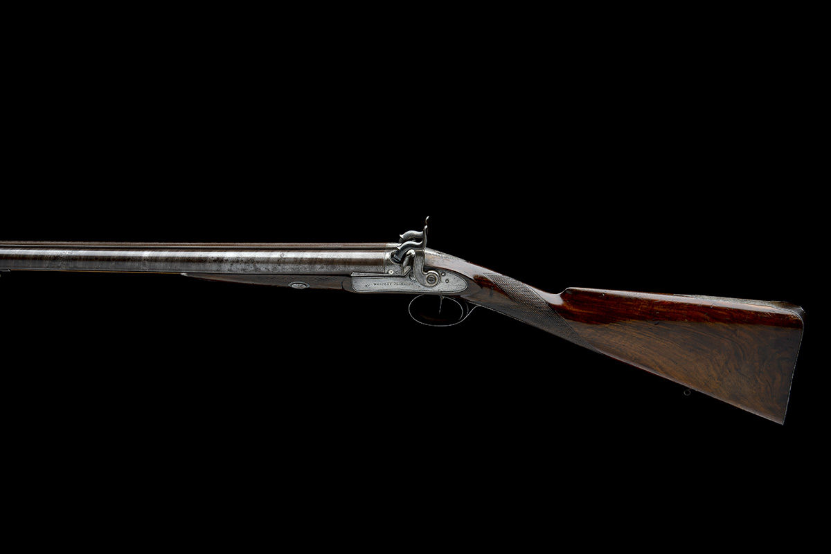 circa 1850, with Continental damascus 30 1/2in. barrels signed 'LONDON' on the rib, pre 1856 French proofs, borderline engraved breech-ends and top-tang, borderline engraved bar-action locks signed 'WESTLEY RICHARDS' in large block letters, chequered walnut half-stock, iron furniture and replacement ramrod, overall length 46 3/4in., weight approximately 9lbs.