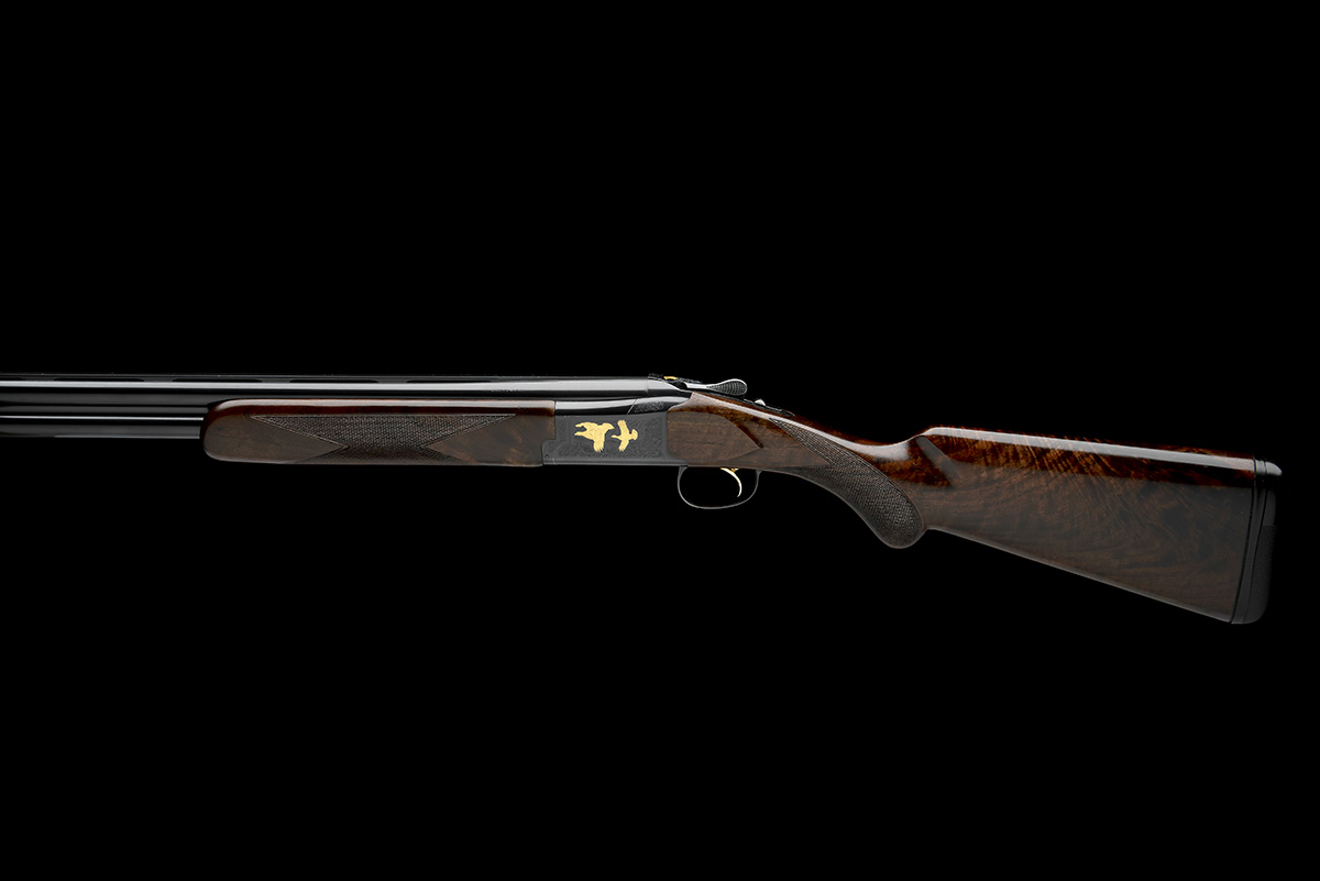 dated 2017, 30in. nitro barrels with 6mm ventilated matt top-rib, 3in. chambers, multichokes (one spare), hold-open toplever, manual safety with integral barrel selector switch, gold-washed single trigger, acanthus scroll engraving surrounding gold-highlighted scenes of pheasant and partridge in flight, blacked finish, 14 3/4in. semi-pistolgrip stock including 7/8in. rubber recoil pad, weight 7lb. 11oz., in its makers universal case