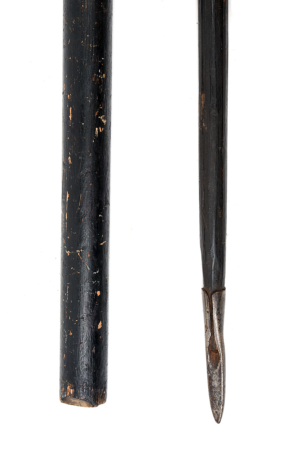 A PAIR OF VICTORIAN COPY PIKES circa late 19th Century, one with 15in. steel blade mounted on 1 1/2in. diameter black-painted shaft with red tassels and felt trim, rusted and worn with splits and losses to shaft, 74in. overall, the other of Italian style, with 10in. steel blade socket-mounted to black-painted wooden shaft with steel terminal, red wire brush decoration, worn, 82in. overall