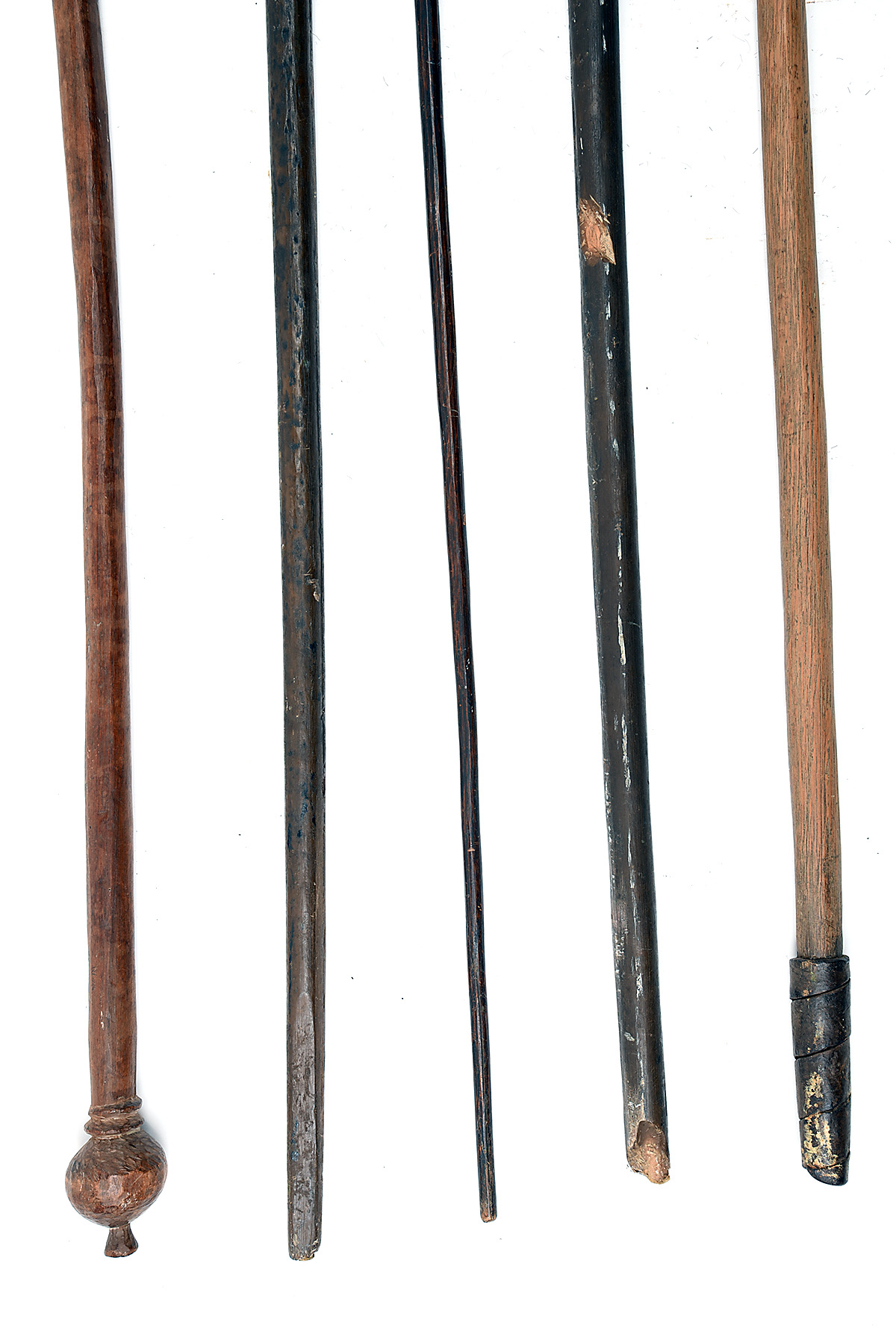A GROUP OF SIX AFRICAN TRIBAL SPEARS circa late 19th Century, one carved wooden fishing spear with six quadruples of barbs (all broken) and string grips, 87in. overall, one relic condition carved wooden fishing spear with losses and all barbs broken, 77in overall, one with forged iron 7 1/2in. plain blade socket-mounted to wooden shaft with wound copper terminal, one with narrow 10in. forged iron blade socket-mounted to light wooden shaft, 66in. overall, one with forged iron heavily rusted 5in. blade socket-mounted onto wooden shaft with carved ball terminal, 67in. overall, and one Maasai hunting 'Lion' spear with narrow heavily rusted 36in. blade socket-mounted to wooden shaft, missing its lower metal terminal shaft, 47in. overall