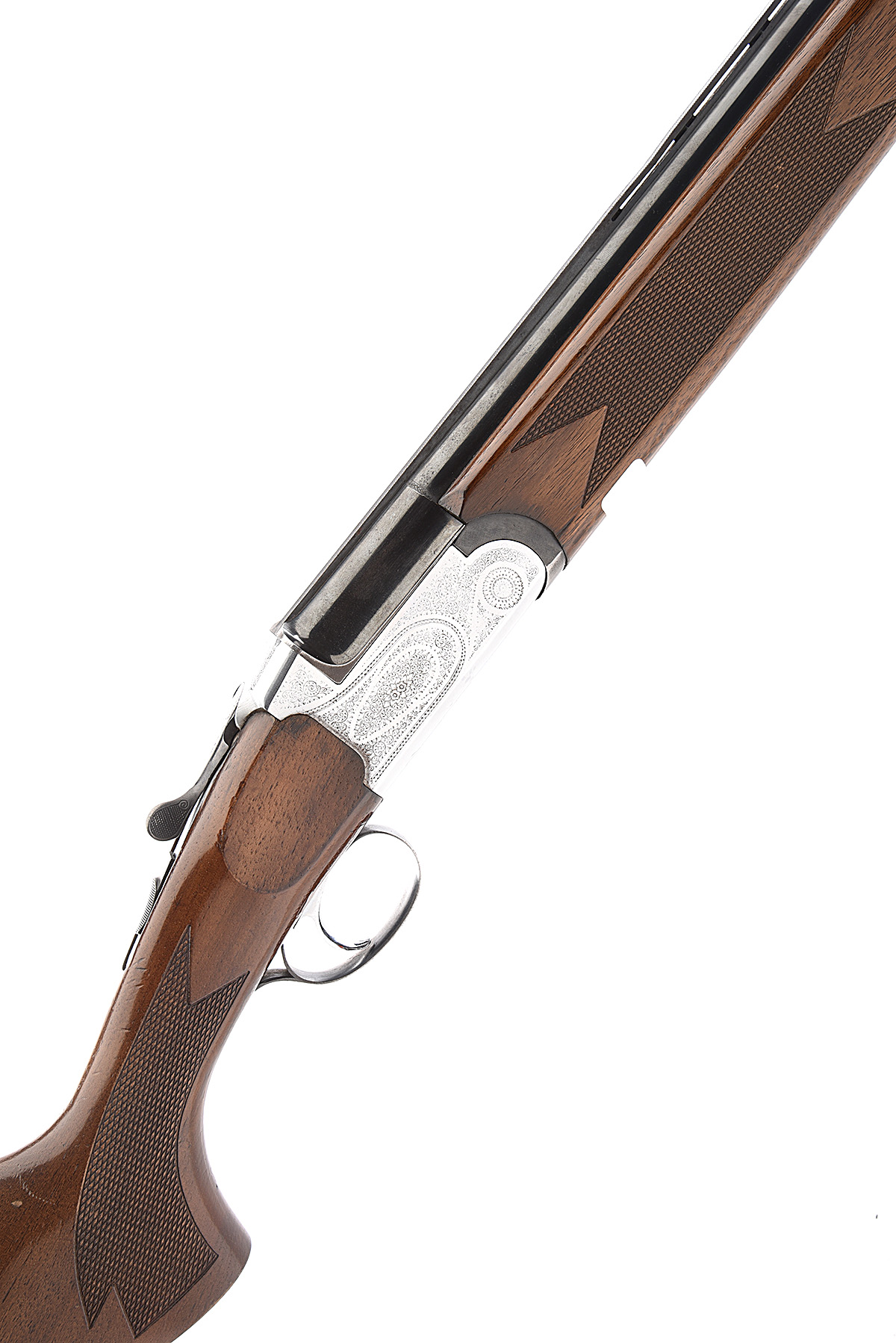 MIDLAND GUN CO. 12-BORE SINGLE-TRIGGER OVER AND UNDER EJECTOR, serial no. 81559, dated 1985, 27 1/2in. nitro barrels with ventilated mid-rib and 6mm ventilated matt top-rib, 2 3/4in. chambers, bored approx. 1/2 and full choke, hold-open toplever, manual safety, border and floral scroll engraving, bright finish, 14 1/4in. pistolgrip stock including buttplate, weight 7lb. 1oz.