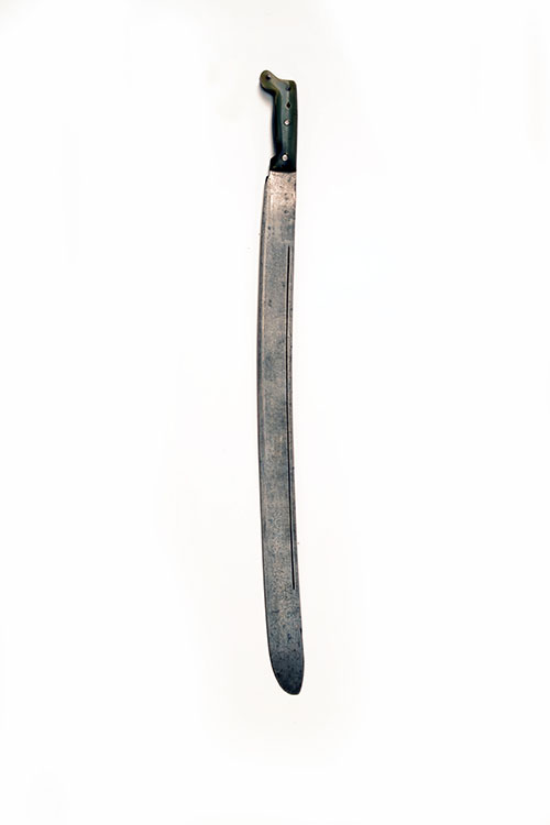 A MACHETE OF EXCEPTIONAL LENGTH SIGNED COLLINS & CO, HARTFORD, MODEL 'LEGITIMUS No. 808', circa 1925, with clip-point 27in. blade, narrow blind fuller along back-edge, signed on the left side 'LEGITIMUS COLLINS & CO HARTFORD ACERO FINO CALIDAD GARANTIZADA No. 808' together with an 'arm and hammer' trademark, two-piece smooth horn grip with extended pommel, no scabbard (mild staining to blade)