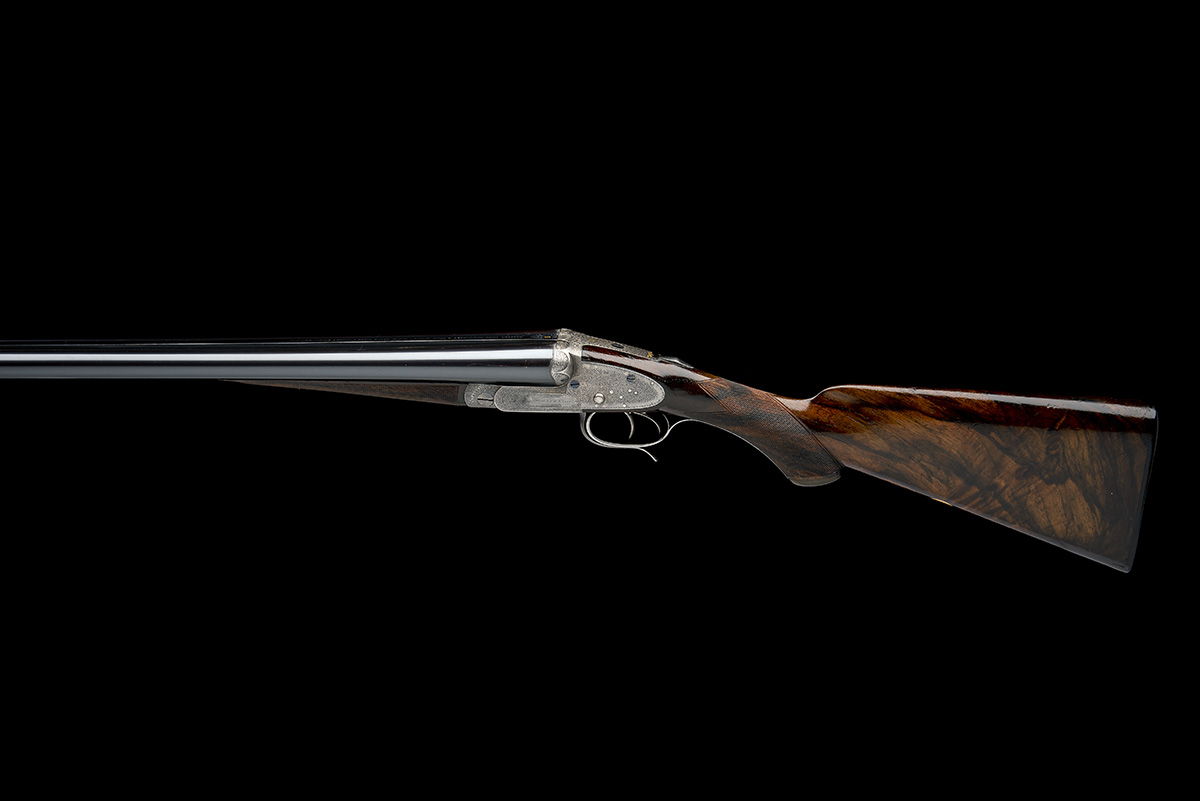 side-clipped arcaded fences, removable striker discs, top strap gold-inlaid '1', automatic safety with gold-inlaid 'SAFE' detail, protruding tumbler pivots with gold-inlaid cocking-indicators, articulated front trigger, fine acanthus scroll engraving, retaining very slight traces of original colour-hardening, 14 1/2in. boldly-figured Prince of Wales pistolgrip stock with horn pistolgrip-cap and buttplate, small wood insert at toe, chequering refreshed, weight 6lb. 9oz. (original barrels) and 6lb. 12oz. (new barrels)