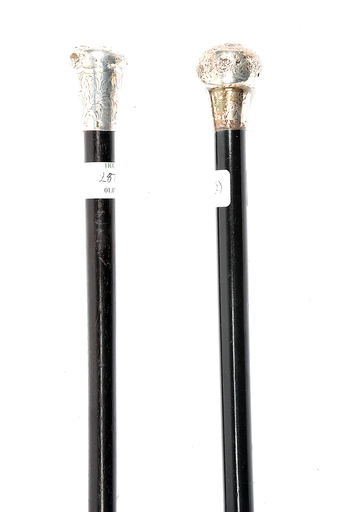 TWO SILVER-TOPPED EBONY WALKING-CANES, the first hallmarked for Jonathan Howell, London 1908, the other unmarked, both with bulbous pommels (one distressed), each approximately 36in. overall