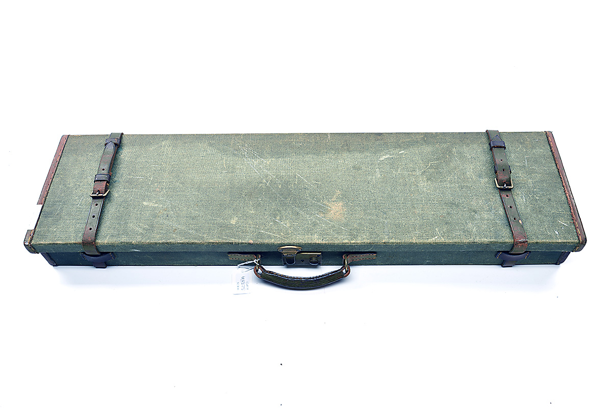 A BRADY GREEN CANVAS & LEATHER SINGLE GUNCASE, fitted for 30in. barrels, the interior lined with green baize, brass lock (key missing)