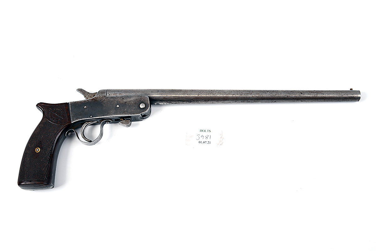 A .410 (2 1/2in.) SINGLE BARRELLED SHOT-PISTOL SIGNED MODERN ARMS CO, MODEL TUKAWAY, serial no. 431,