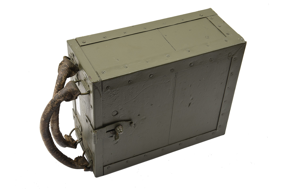 A WOODEN AMMUNITION BOX CONTAINING STRIPPER-CLIPS FOR THE BESA MACHINE-GUN, circa 1940s olive-green with steel fittings and leather-covered carrying handles, divided internally into three sections containing 11 steel strippers, no markings, good, solid construction