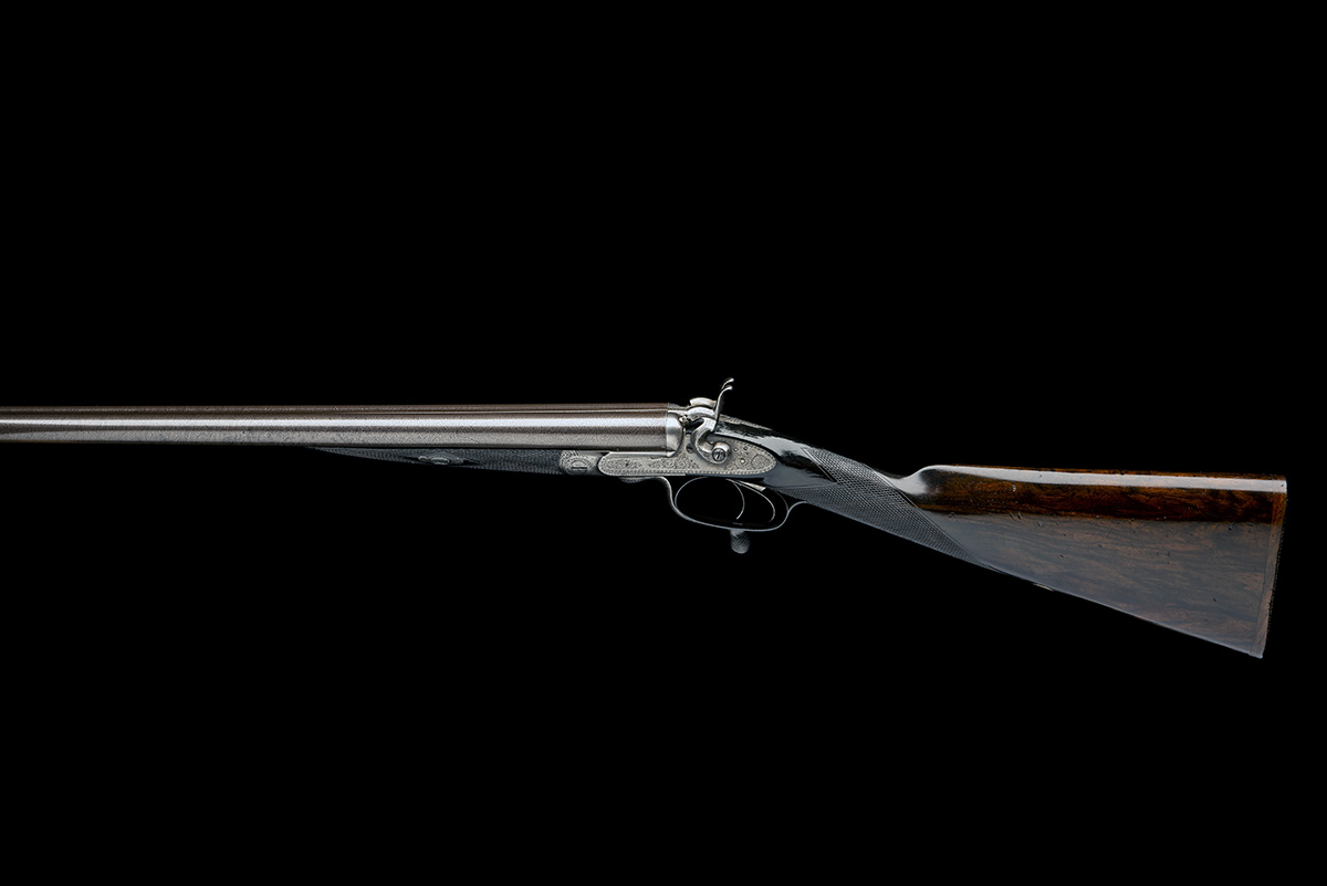 circa 1855, 28 3/4in. nitro reproved damascus barrels, rib engraved '1' and 'THOMAS BOSS. 75 ST. JAMES'S STREET. LONDON.', 2 3/4in. chambers, bored approx. true cyl. choke in both, converted from muzzle loading by Edward Paton, Jones patent rotary-underlever, rebounding sidelocks with carved c-scroll hammers, best border and acanthus scroll engraving, retaining very slight traces of colour-hardening and finish, the action flat signed Edward Paton, bowed triggerguard engraved with a hound, 14 1/2in. well-figured stock including wooden buttplate, weight 7lb. 2oz.