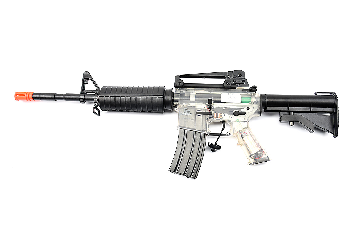 A BOXED 6mm (BB) ELECTRONIC AIR-SOFT AIR-RIFLE, MODEL 'GFM4C AEG CARBINE', no visible serial number, in imitation of a CAR 15 type assault rifle with 16in. barrel and transparent receiver to comply with UK law, 30in. overall in its makers card and polystyrene carton with accessories, untested