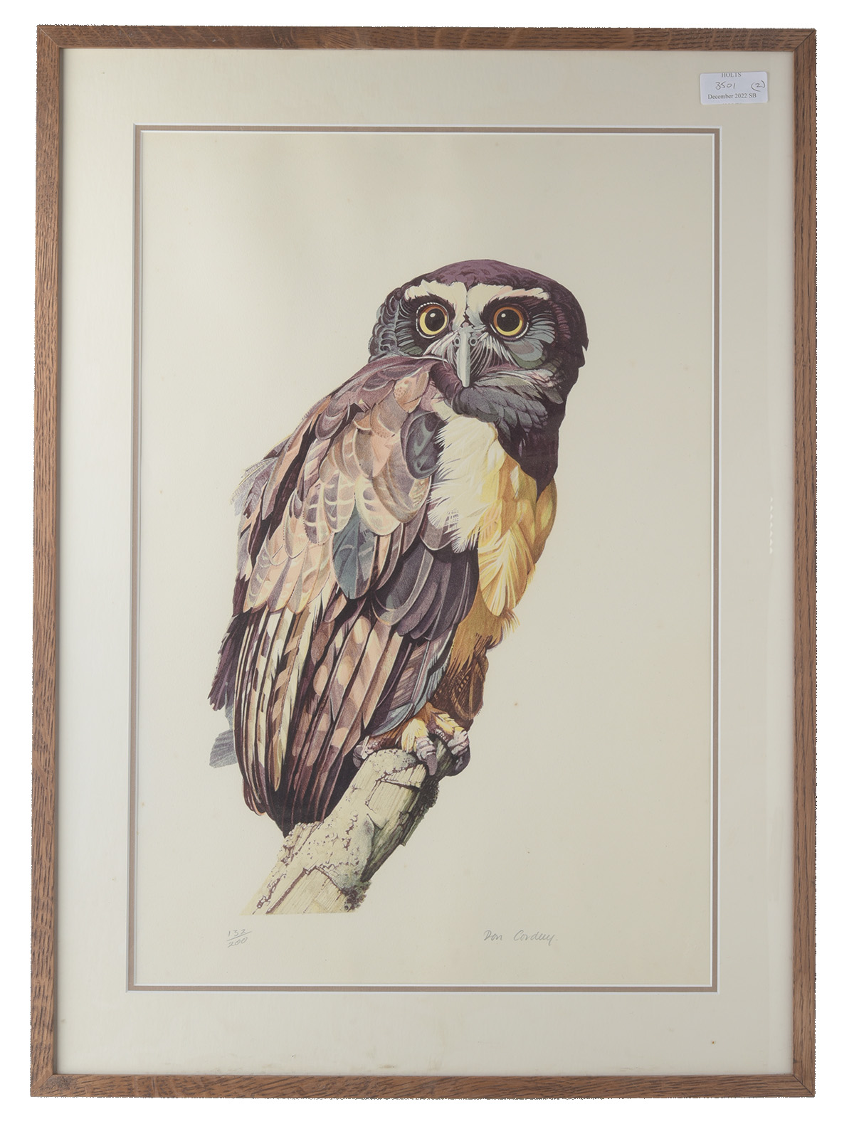 A COLLECTION OF TWO LIMITED EDITION PRINTED BY DON CORDUY, 1 x no 132 of 200 of an owl, 1 x no 107 of 150 of peregrine falcon, both measuring approx. 29in. x 21in.