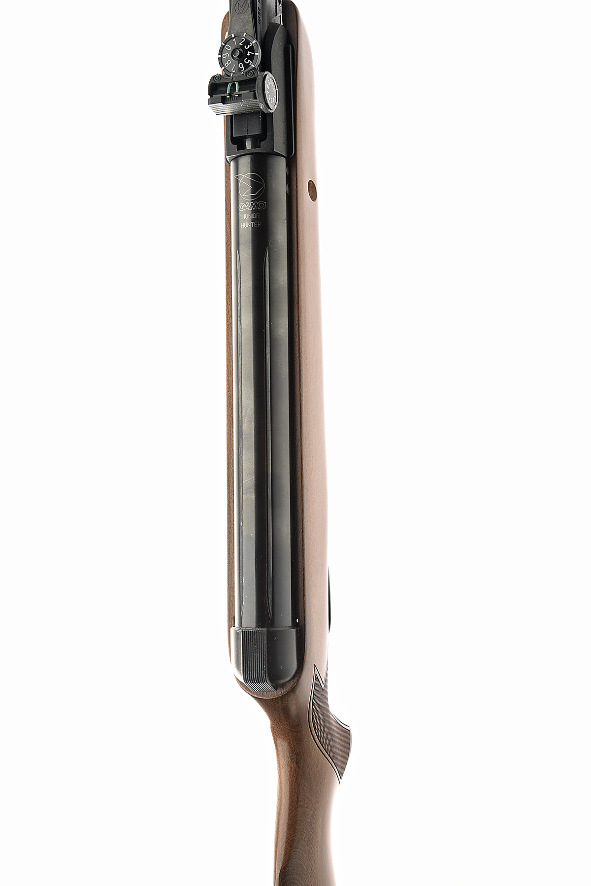 A .177 BREAK-BARREL AIR-RIFLE, SIGNED GAMO 'MODEL JUNIOR HUNTER', serial no. 04-1C-265259-14, 15in. barrel, ramped high-visibility fore-sight with tunnel protector, adjustable open rear sight, air chamber with integral sight rail, blued finish, manual safety, chequered pistolgrip halfstock, 12 1/4in. pull, in a full-length ABS case