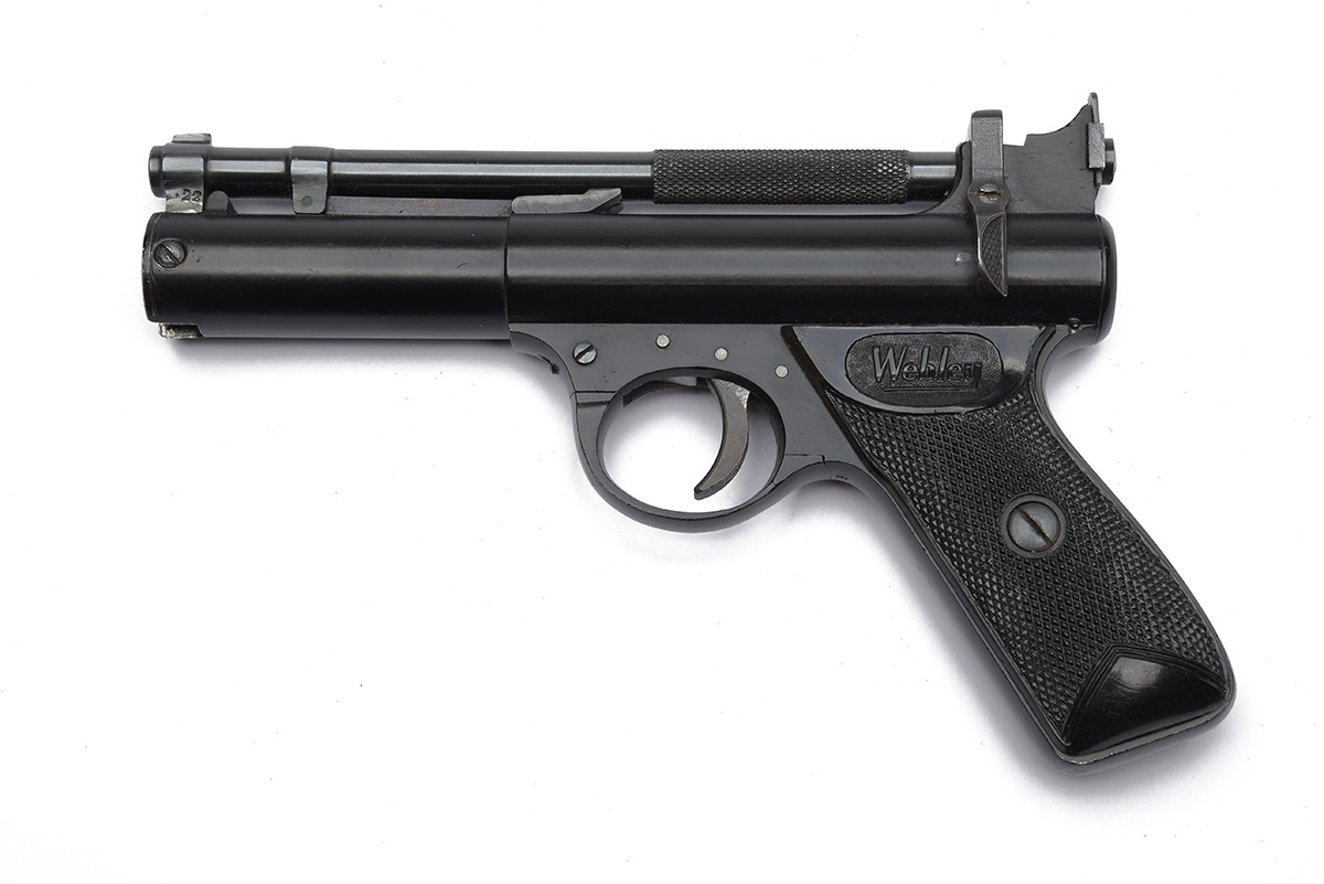 A .22 BARREL-COCKING AIR-PISTOL SIGNED WEBLEY & SCOTT, MODEL 'PREMIER' batch no. 99, with a 6 3/4in, barrel, open sights, baked enamelled finish with black vulcanised grips.