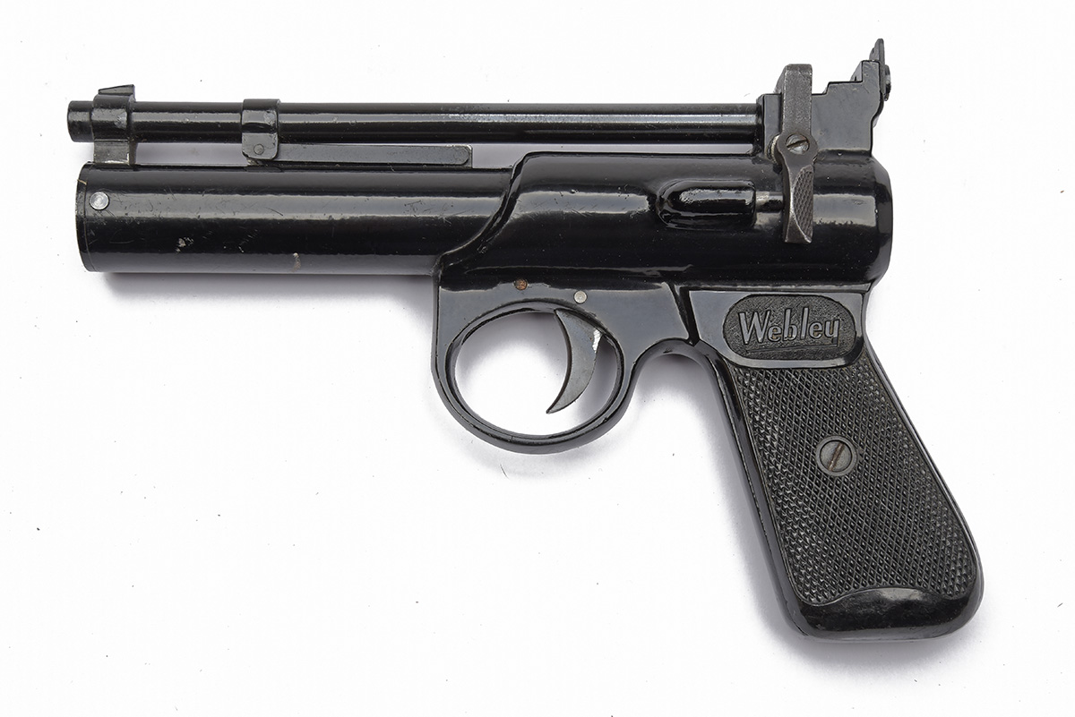 A .177 BARREL-COCKING AIR-PISTOL SIGNED WEBLEY & SCOTT, MODEL 'JUNIOR' batch no. 674, with a 6in. barrel, open sights, stone enamelling finish to metalwork, vulcanised grips.