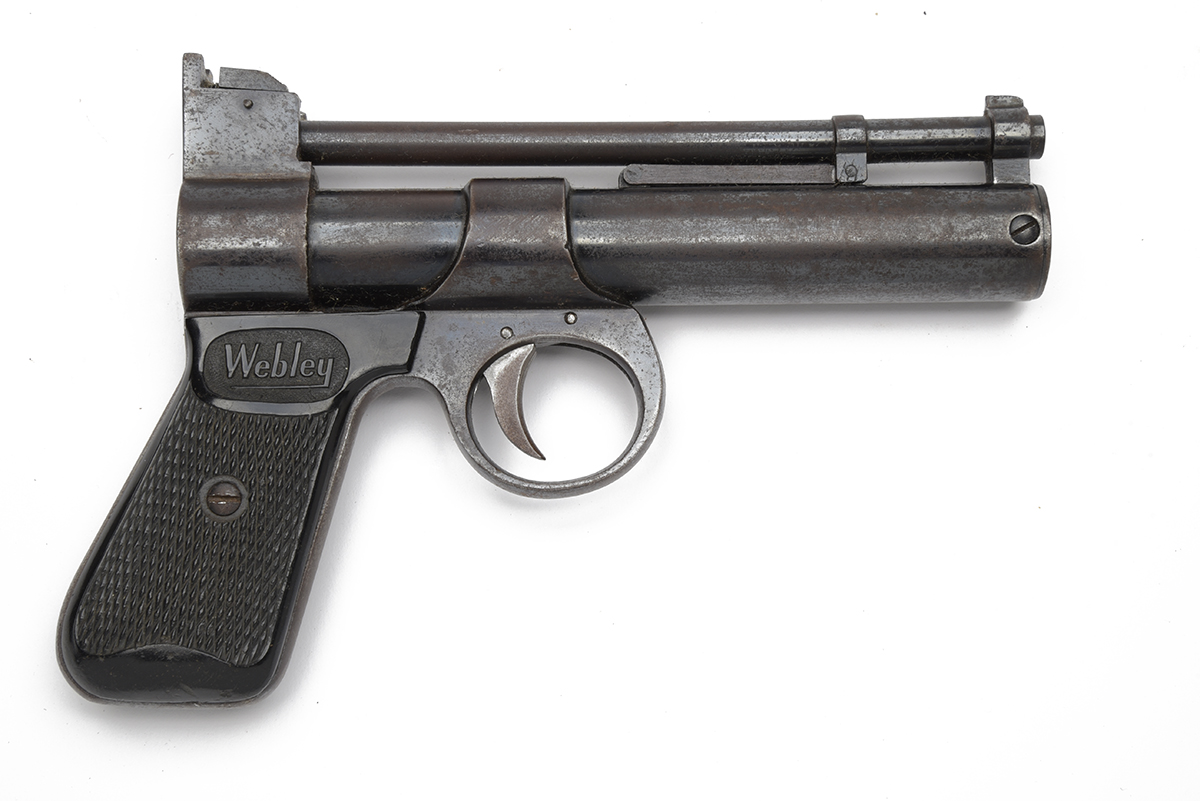 A BOXED .177 BARREL-COCKING AIR-PISTOL SIGNED WEBLEY & SCOTT, MODEL 'JUNIOR' batch no. 433, with a 6in. barrel, open sights, some of the original finish intact, black vulcanised hand grips.